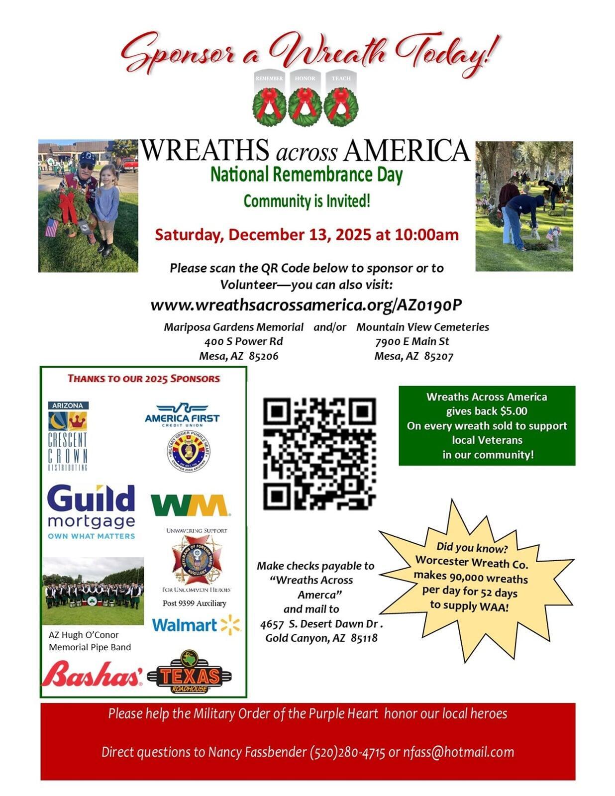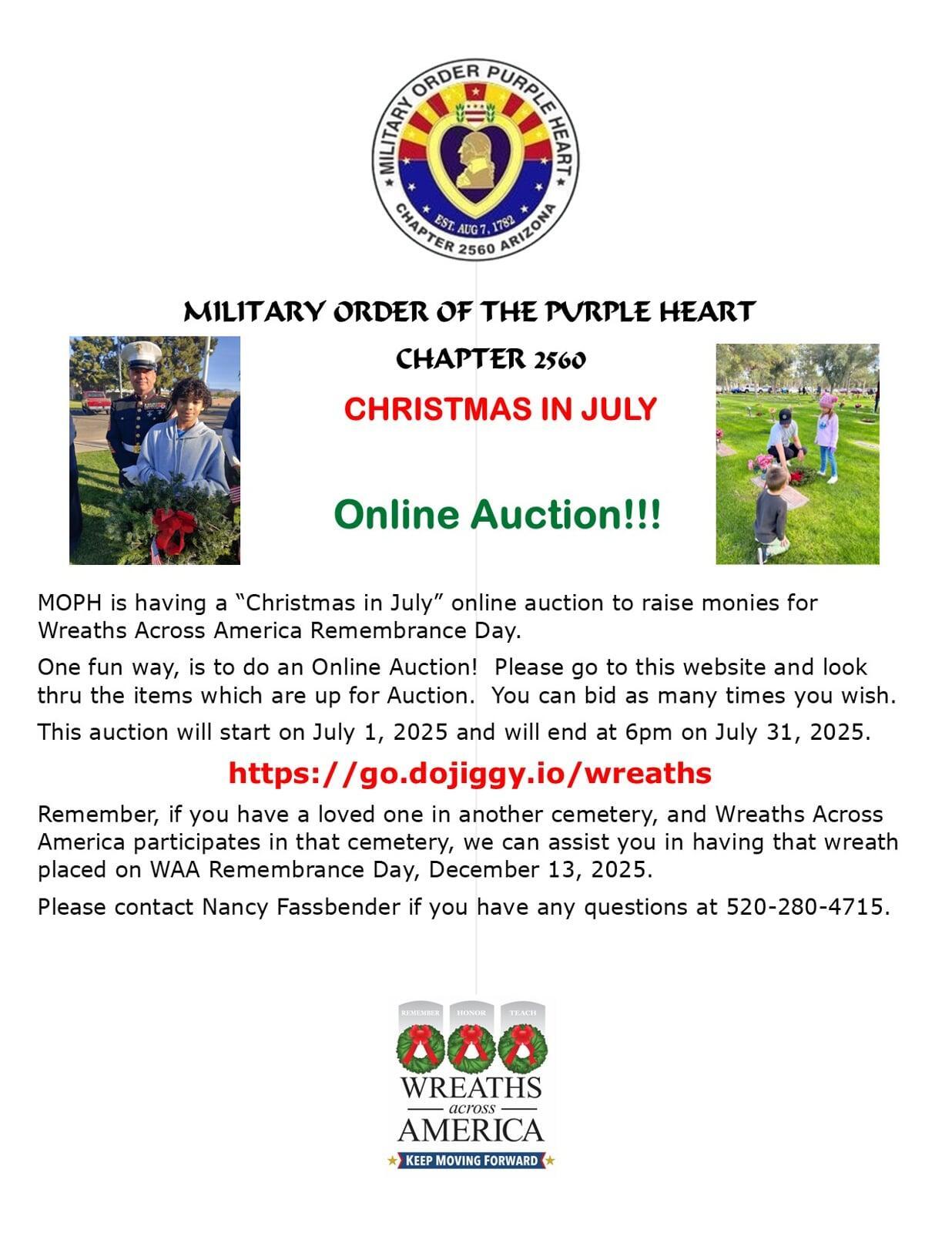 Chapter 2560 of the Military Order of the Purple Heart is hosting a "Christmas in July" Online Auction to raise funds for this year’s Wreaths Across America Remembrance Day on Saturday, December 13, 2025. Your participation directly helps us honor the heroes laid to rest in Arizona and beyond.